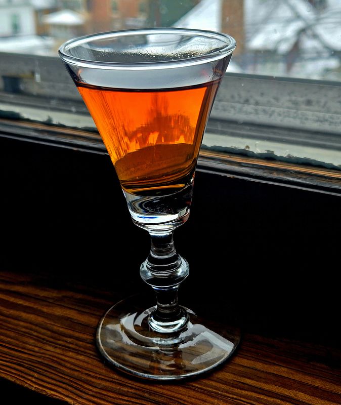 A sherry glass of Medjool Date Sipping Liqueur sitting on a vintage window sill with snow capped houses in the background.