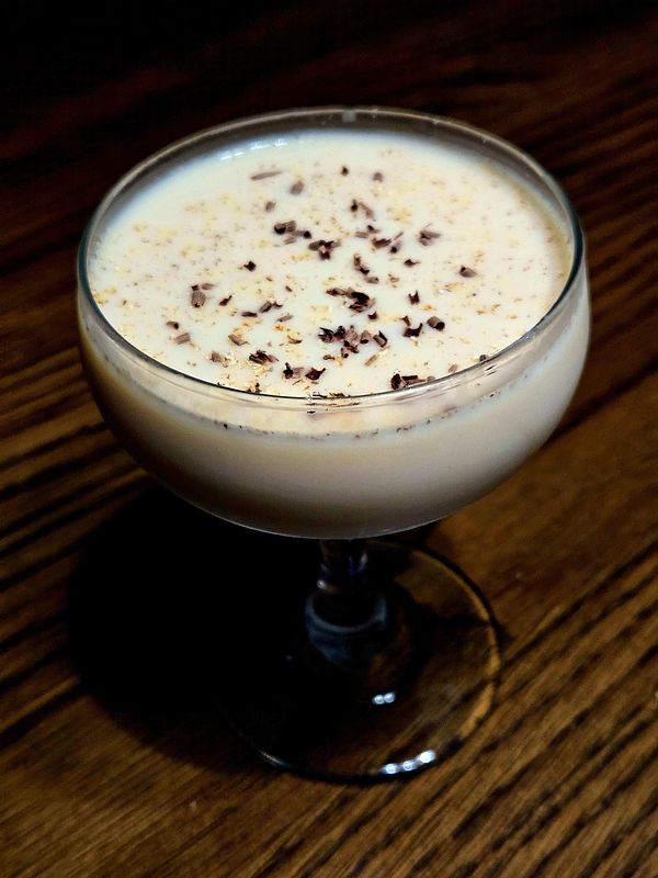 Chill your glass. In one half of your tin add all ingredients sans garnishes. Load the other tin with ice as you normally would for a shaken cocktail. Combine the tins for a shake until the drink is well chilled. Fine Strain into your glass and garnish with freshly grated nutmeg and shaved chocolate.