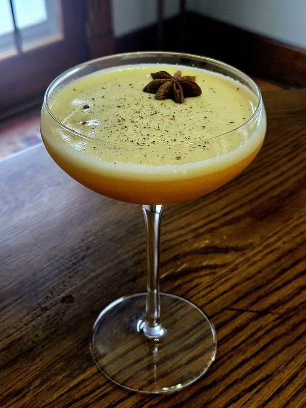 Chill your glass. Then, the shaker tin with all the ingredients sans garnishes. Bring the tin together and dry shake this (i.e., without ice) really well to develop the proper foam structure. I aim for at least a 20 count and sometimes up to 30. Once dry shaken, load the tin with ice and shake as you would normally. Fine strain the cocktail into your glass, dust with Allspice and float your Star Anise pod. Enjoy.