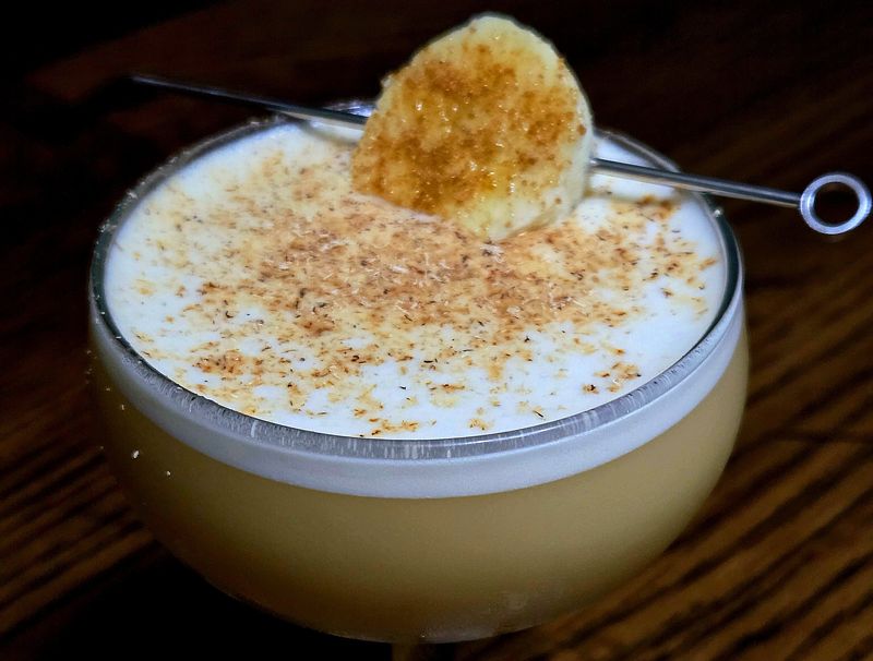 Chill your glass thoroughly - the colder the better because it will give the drink better structure to cling and endure several tips, still maintaining its froth and pillowy head. Then, load a shaker tin with all the ingredients sans garnish. Bring the tin together for a dry shake (i.e., without ice). Don’t worry about the calories in this drink as you’ll burn them beforehand during the dry shake, which should be a good 20-30 count. Once dry shaken, load the tin with ice for a normal shake (I like about a 15-17 count). Afterward, fine strain the drink into your glass, sprinkle you banana medallion with coconut sugar, skewer, and garnish the drink. Grate the nutmeg over the drink and enjoy (I’m admittedly a nutmeg fiend and always heavy-handed here). This is a drink Dairy Queen could really get behind.